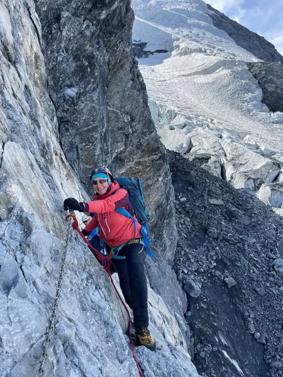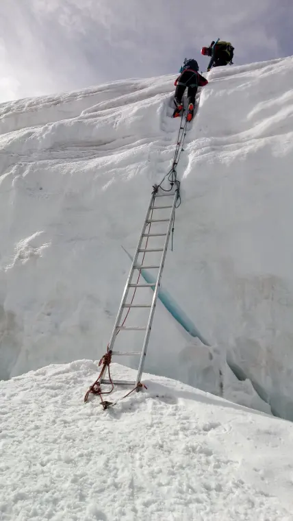 Gleich nach dem Frühstück brechen wir noch bei Dunkelheit auf. Zunächst im Gehgelände, dann leicht kraxelnd, geht es zum Kettenwandl, einer etwa 30 m hohen Steilstufe. Dank der vorhandenen Sicherungen überwinden wir diese problemlos und gelangen über den Grat zur Traverse, über die wir bald den Gletscher erreichen, am Ende noch einen kurzen Klettersteig überwindend.